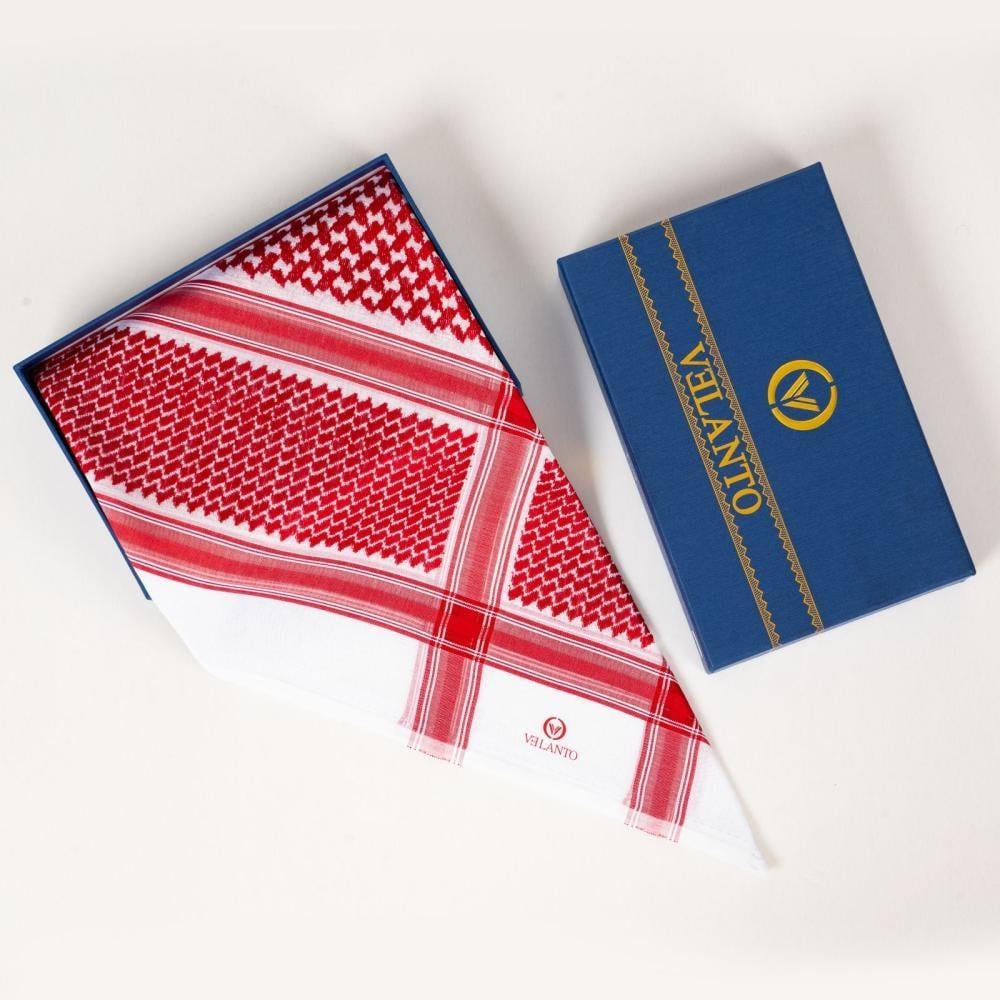 انضم إلى عالم الأناقة والفخامة مع شماغ فلانتو VELANTO الاصدار الجديد باللون الأحمر الغامق، واجعل أسلوبك يتباهى بالتميز والأناقة."